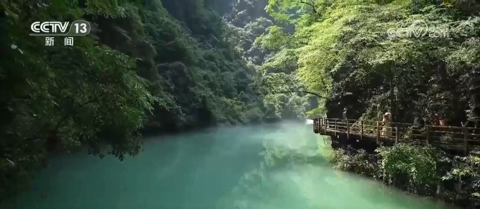 在大峡谷谷底,形态各异的峰林与缓缓流淌的溪水构成了天然画卷,阵阵微凉的山风吹来,游客们仿佛漫步在原始森林中,在喧嚣的夏天中感受到了一份难得的静谧和凉爽。