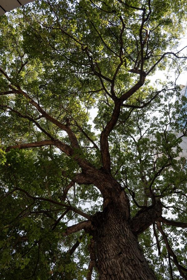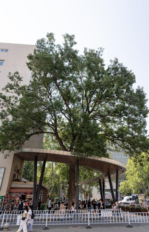 “这树可真精神!”初见这棵树时,同行的伙伴忍不住赞叹,“笔直挺拔,纹理苍劲,是咱见过最高、最直的古树了。”仰首望去,树干如巨柱擎天,虬枝舒展,在天际线上勾勒出苍翠的剪影。古树浓荫下,一座环抱其身的凉亭熙熙攘攘。纳凉歇脚的患者、躲日头的行人、闲话家常的老人,都在这片天然“绿伞”下找到了片刻安适。一位老街坊告诉我们:“早些年重修医院路口时,特意绕着老树盖了这亭子。夏天日头毒,这儿就是大家公认的‘风水宝地’。”这份源于自然的“心意”,早已越过围墙,浸润了整条街巷,成为路人共享的清凉驿站与温情角落。