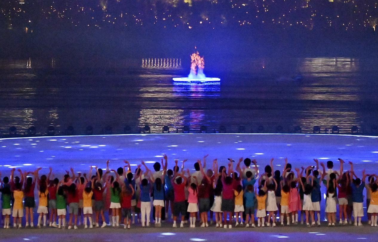 宣布开幕瞬间,象征世运会会徽和“World”的“W”造型焰火点亮夜空;极具创意和挑战的点火仪式,火炬“竹梦”成功点燃世运会首个“水火相融”于湖中的火炬塔,绚烂的火焰交相辉映。
