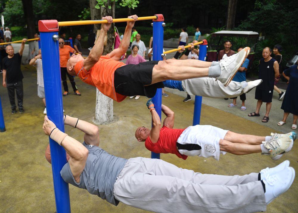 2024年6月18日,健身爱好者在四川成都新华公园内锻炼。