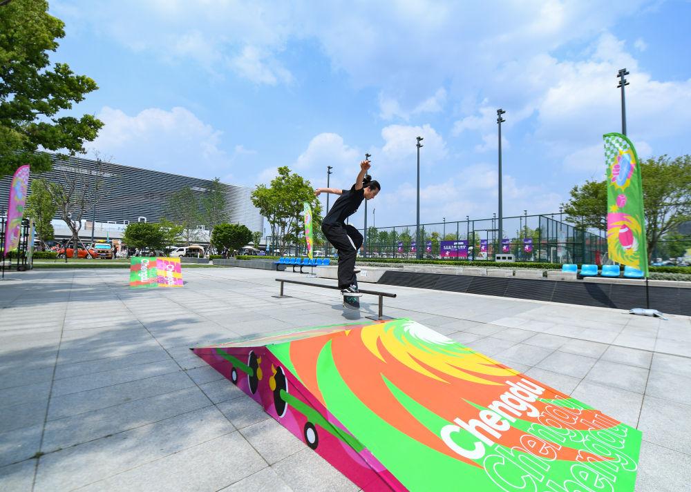 2023年4月19日,体育爱好者在四川成都东安湖体育公园练习滑板。