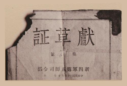 7月21日,在位于湖北省孝感市大悟县芳畈镇白果树湾村的新四军第五师纪念馆内,一张照片引起了记者的注意。照片拍摄的是新四军第五师司令部于1944年10月签发的一张献草证,证书背面写着:“悟峰乡一保八村徐恒照先生,收到你献给部队的稻草30斤,我们十分感谢。今后我全体指战员当用积极抗战,保卫根据地,努力学习,加强生产来报答你们,并在你们农事生产时给你们以最大帮助!”