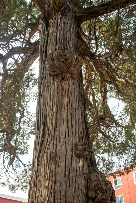 如今的我们,站在这株2300多岁的古树旁,仰头望去,只见古柏的枝干扭曲盘踞,似古藤缠石,在嶙峋怪诞中透出倔强的生命力;凑近了看,古柏之躯如青铜巨柱,皲裂的树皮,深褐与浅灰色层层叠叠,如老龙鳞甲。