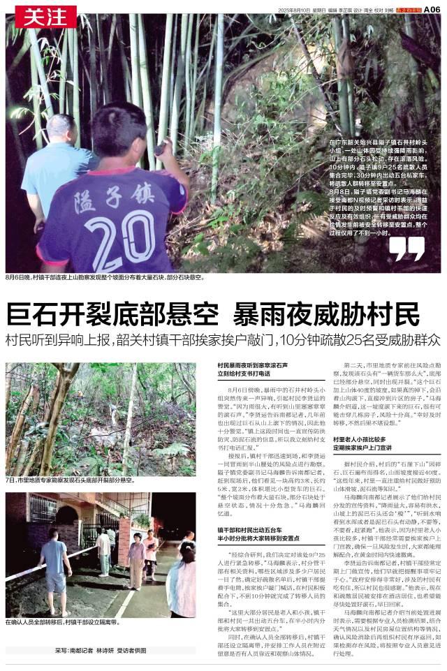 在广东韶关始兴县隘子镇石井村岭头小组,一处山体因受持续强降雨影响,山上有部分石头松动,存在滚落风险。10分钟内,隘子镇9户25名疏散人员集合完毕,30分钟内出动五台私家车,将疏散人群转移至安置点。