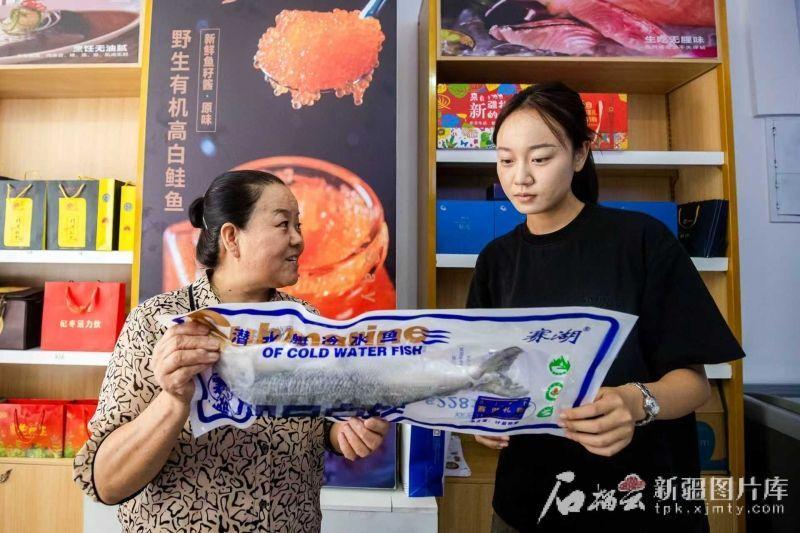在赛里木湖经营特产店的商户向游客推荐特色产品。(资料图)楠登 摄