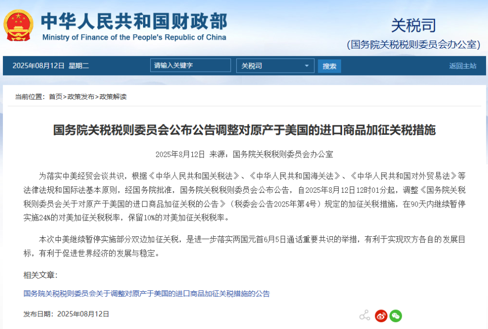 为落实中美经贸会谈共识,根据《中华人民共和国关税法》、《中华人民共和国海关法》、《中华人民共和国对外贸易法》等法律法规和国际法基本原则,经国务院批准,国务院关税税则委员会公布公告,自2025年8月12日12时01分起,调整《国务院关税税则委员会关于对原产于美国的进口商品加征关税的公告》(税委会公告2025年第4号)规定的加征关税措施,在90天内继续暂停实施24%的对美加征关税税率,保留10%的对美加征关税税率。