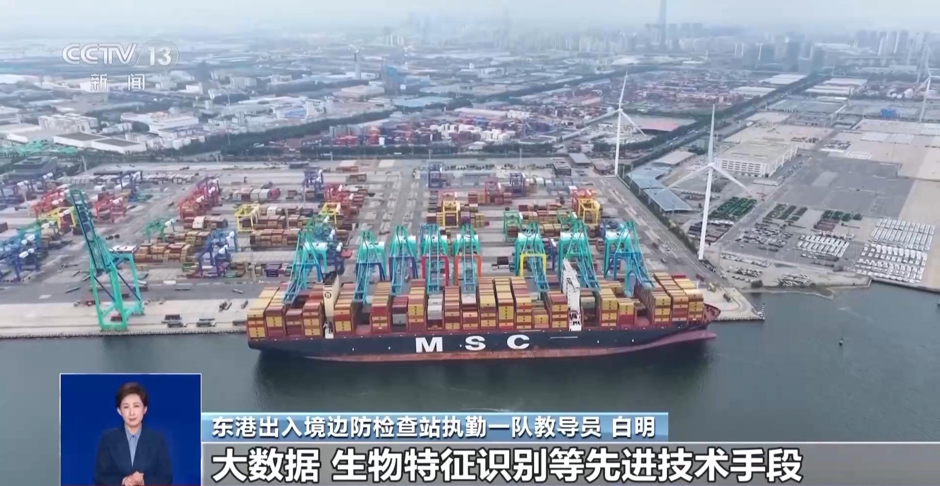 东港出入境边防检查站执勤一队教导员 白明:我们综合运用数字孪生、人工智能、大数据、生物特征识别等先进技术手段,在全国率先实现口岸全时空智能监管、全要素精准感知、港口边检行政许可全天候受理,助力天津港与上合组织成员国的贸易通道更加顺畅。