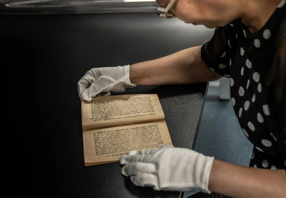 8月4日,辽沈战役纪念馆工作人员展示馆内收藏的穆青同志采写的《东北抗日联军斗争史略》。(辽沈战役纪念馆供图)