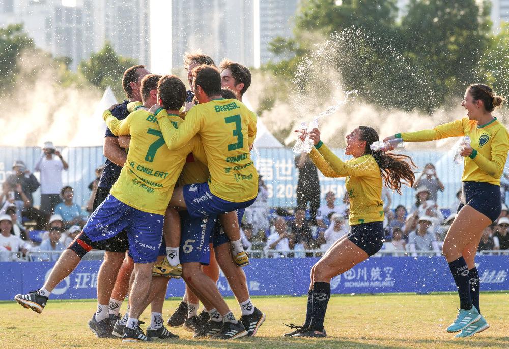 8月13日,巴西女子浮士德球队球员在赛后进入场内共同庆祝。新华社记者 陈诚 摄