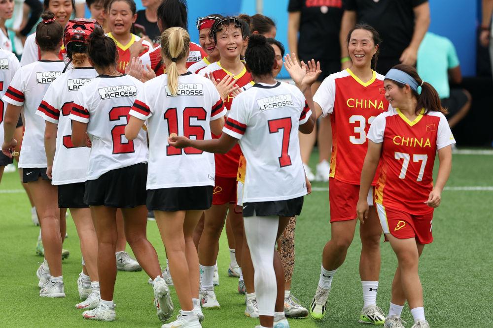8月9日,中国棍网球队球员与加拿大队球员赛后击掌致意。新华社记者 陈斌 摄