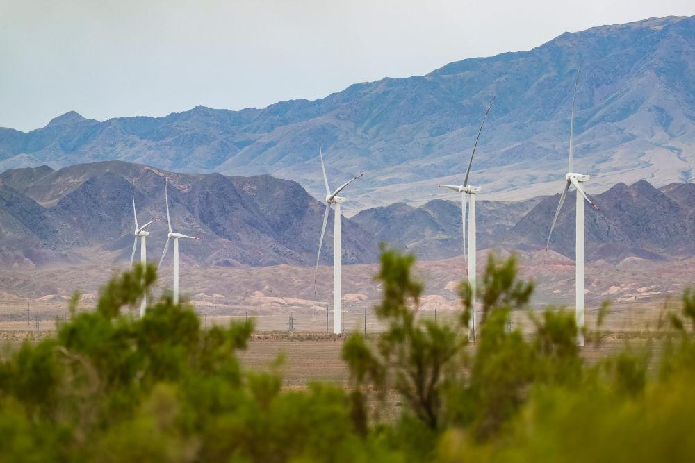 这是2024年6月25日在哈萨克斯坦阿拉木图州谢列克风电场拍摄的风机。哈萨克斯坦谢列克风电项目是中哈高质量共建“一带一路”的标志性项目。新华社记者 白雪骐 摄