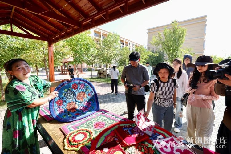 8月12日,哈萨克族刺绣代表性传承人玛依努尔向记者介绍哈萨克族刺绣。