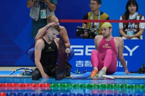 8月11日,冠军匈牙利选手基什(左)在男子200米水面蹼泳决赛后和其他选手交流。