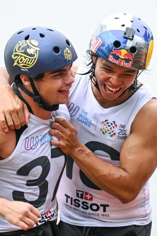 8月10日,在2025年成都世运会男子索道滑水决赛后,菲律宾选手特立尼达(右)庆祝法国选手德绍获得冠军。