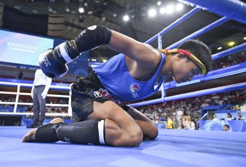 8月10日,墨西哥选手布尔戈斯·洛佩斯(前)在夺得2025年成都世运会泰拳女子48公斤级冠军后庆祝。泰拳起源于泰国,最初是泰民族使用的军事技法,后传入民间,逐渐演变为现代的泰拳运动。