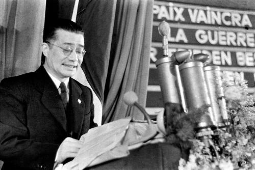 1951年2月21日至26日,世界和平理事会首届会议在柏林举行,中国代表梅汝璈在会议上发言。新华社记者 齐观山 摄