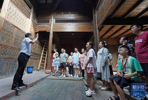 2025年8月1日,梅汝璈故居讲解员梅庭军(左一)向游客介绍梅汝璈。