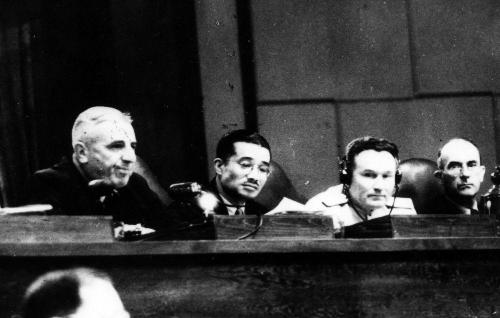 梅汝璈(左二)在东京审判现场(资料照片)。