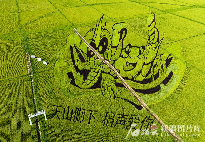 8月8日,航拍察布查尔锡伯自治县纳达齐牛录乡的“稻田画”。石榴云/新疆日报记者 周鹏摄