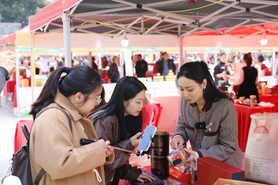 2024年12月,“福农优品·我在家乡等你来”(第二季)乡约福建网络直播活动在安溪县人民广场举办,现场共设置70个展位,吸引了众多群众品尝、选购。图为主播们对参展企业及产品进行直播推介,体验安溪的特色物产。海峡网供图