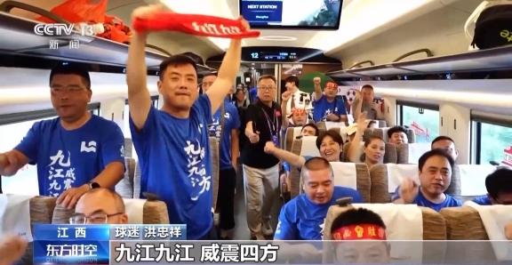 两个多小时的车程在球迷的歌声中转瞬即逝。只见九江球迷自发组成的助威团正卖力喊着口号、敲着大鼓,整个站台激情的氛围仿佛让人已经来到赛场。