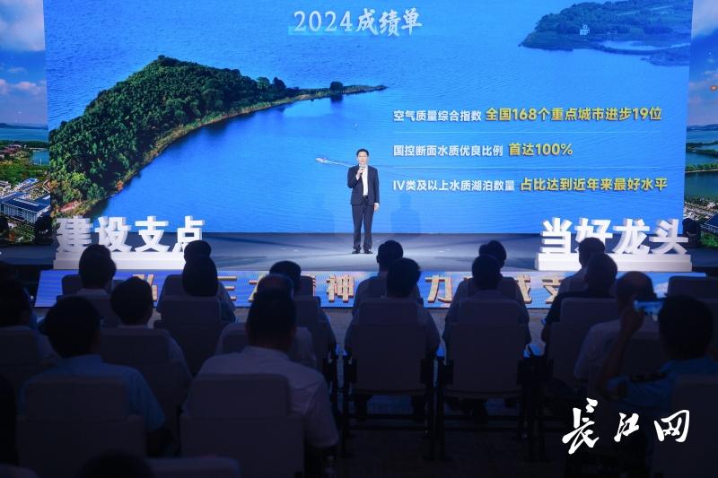 武汉市生态环境局党组书记、局长张朝辉在“打造美丽中国先行区建设示范标杆 整体提升战略支点生态承载力”主题报告会上作报告。记者彭年 摄