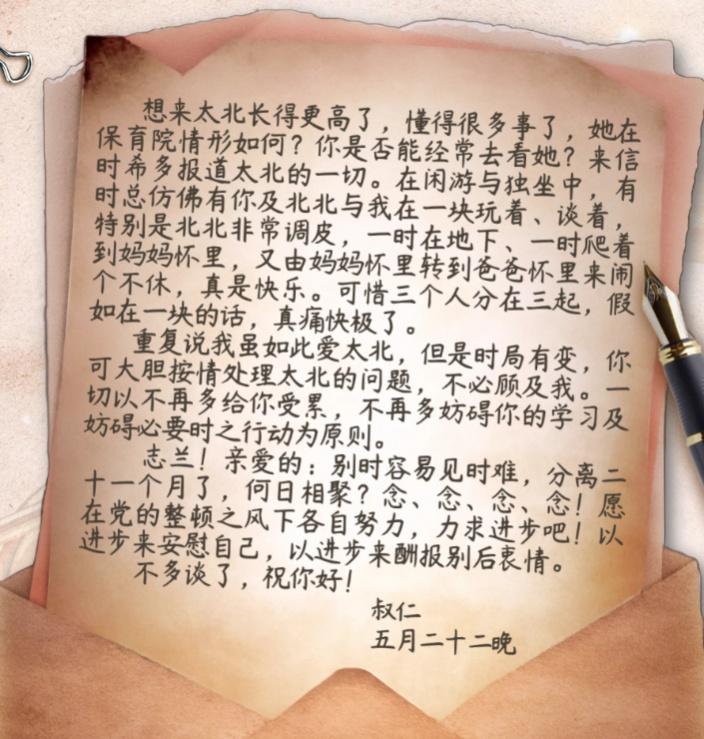 在信的最后,左权不得不忍痛交代妻子:“我虽如此爱太北,但是时局有变,你可大胆按情处理太北的问题,不必顾及我。”并勉励妻子以进步来安慰自己,以进步来酬报别后衷情。