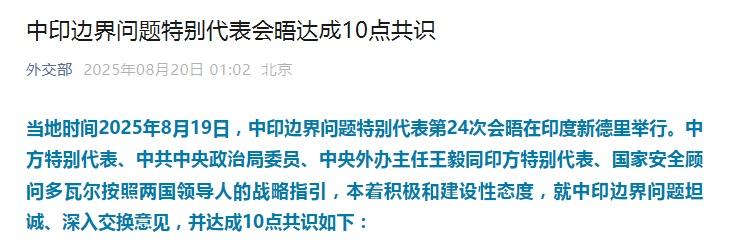 当地时间2025年8月19日,中印边界问题特别代表第24次会晤在印度新德里举行。中方特别代表、中共中央政治局委员、中央外办主任王毅同印方特别代表、国家安全顾问多瓦尔按照两国领导人的战略指引,本着积极和建设性态度,就中印边界问题坦诚、深入交换意见,并达成10点共识如下: