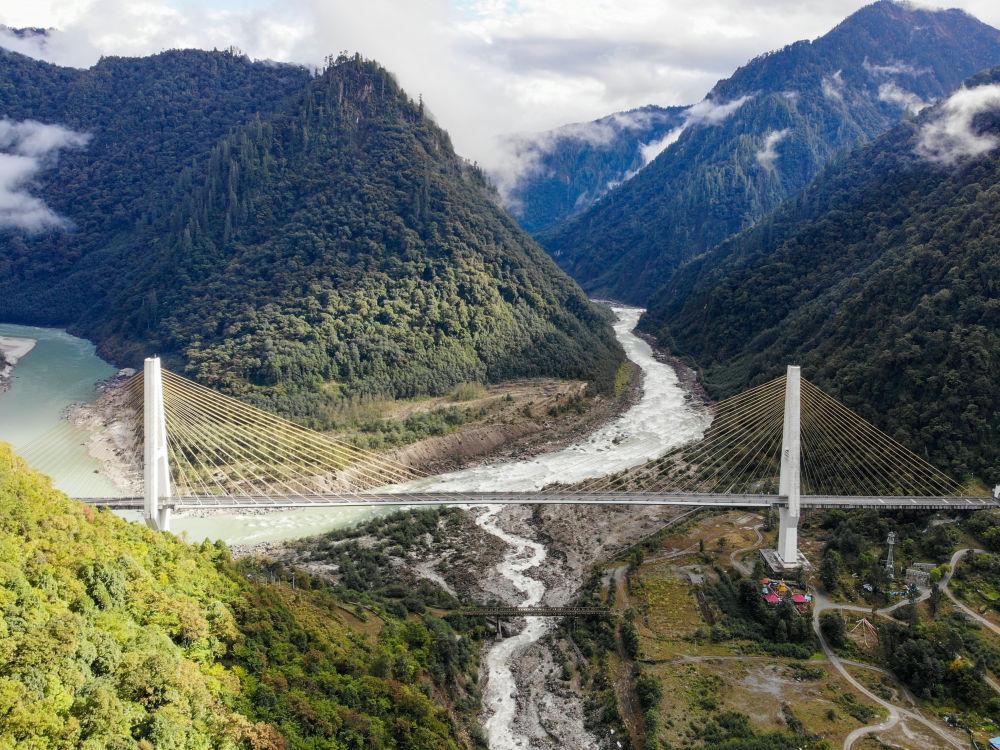 2019年10月27日拍摄的川藏公路通麦路段上的迫龙沟特大桥。 新华社记者 孙非 摄