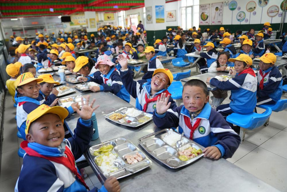 2024年9月3日,西藏林芝市工布江达县娘蒲乡中心小学的学生们在享用午餐。新华社记者 晋美多吉 摄