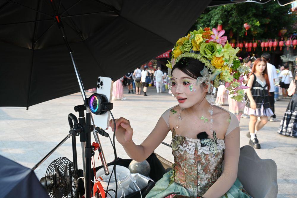 8月18日,福建泉州蟳埔村,工作人员通过手机直播为游客介绍“簪花围”旅拍业务。