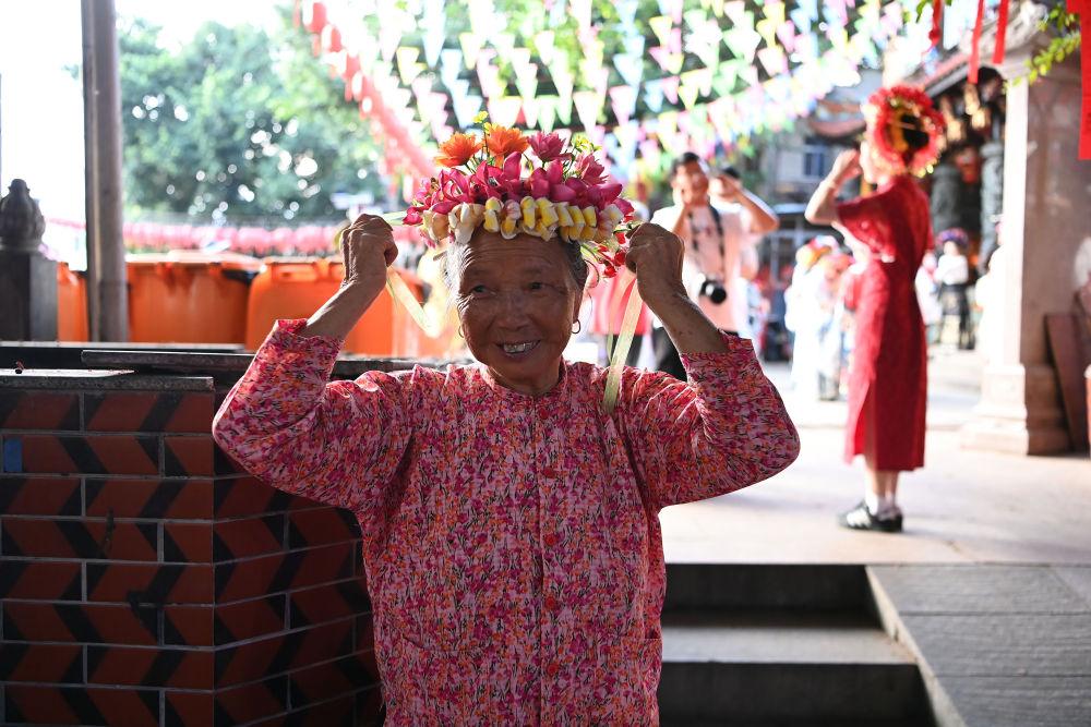 8月18日,福建泉州蟳埔村,一名卖鲜花花围的蟳埔女在做展示。