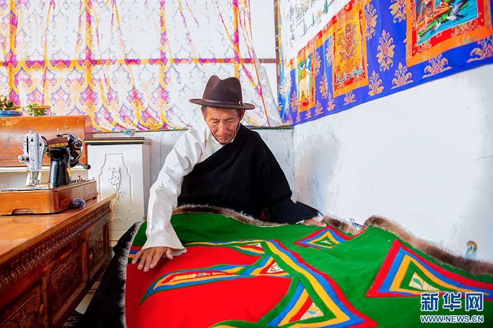“噶尔传统服饰”地区级代表性传承人石达次仁在介绍自治区级非物质文化遗产“噶尔传统服饰”(6月14日摄)。“噶尔传统服饰”由羊羔皮和呢子内外两面缝制而成,形状为正方形,制作简易,内里均为纯白色的羊羔皮,羊羔皮既保暖又有装饰性。新华网 旦增努布 摄