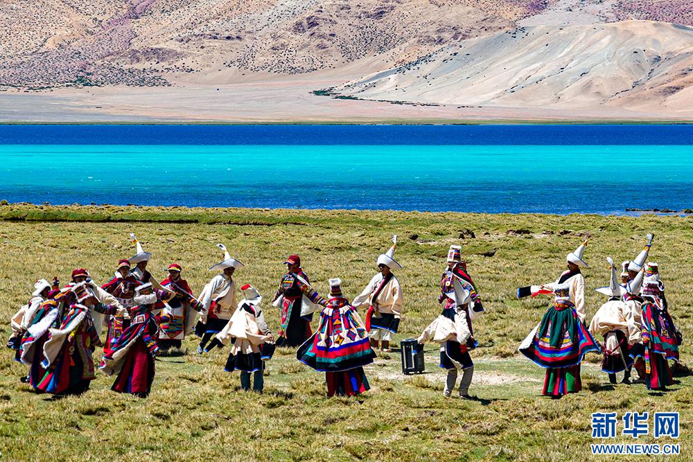 身穿自治区级非物质文化遗产“森郭服饰”的改则县群众在湖畔跳锅庄(6月21日摄)。“森郭服饰”被誉为“五彩彩虹服”,主要由红、绿、黑、黄、蓝五种颜色的氆氇制成。新华网 旦增努布 摄