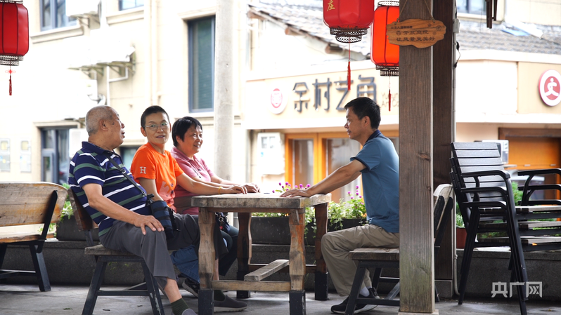 潘春林与住宿游客畅谈余村变化(央广网记者 尚天宇 摄)