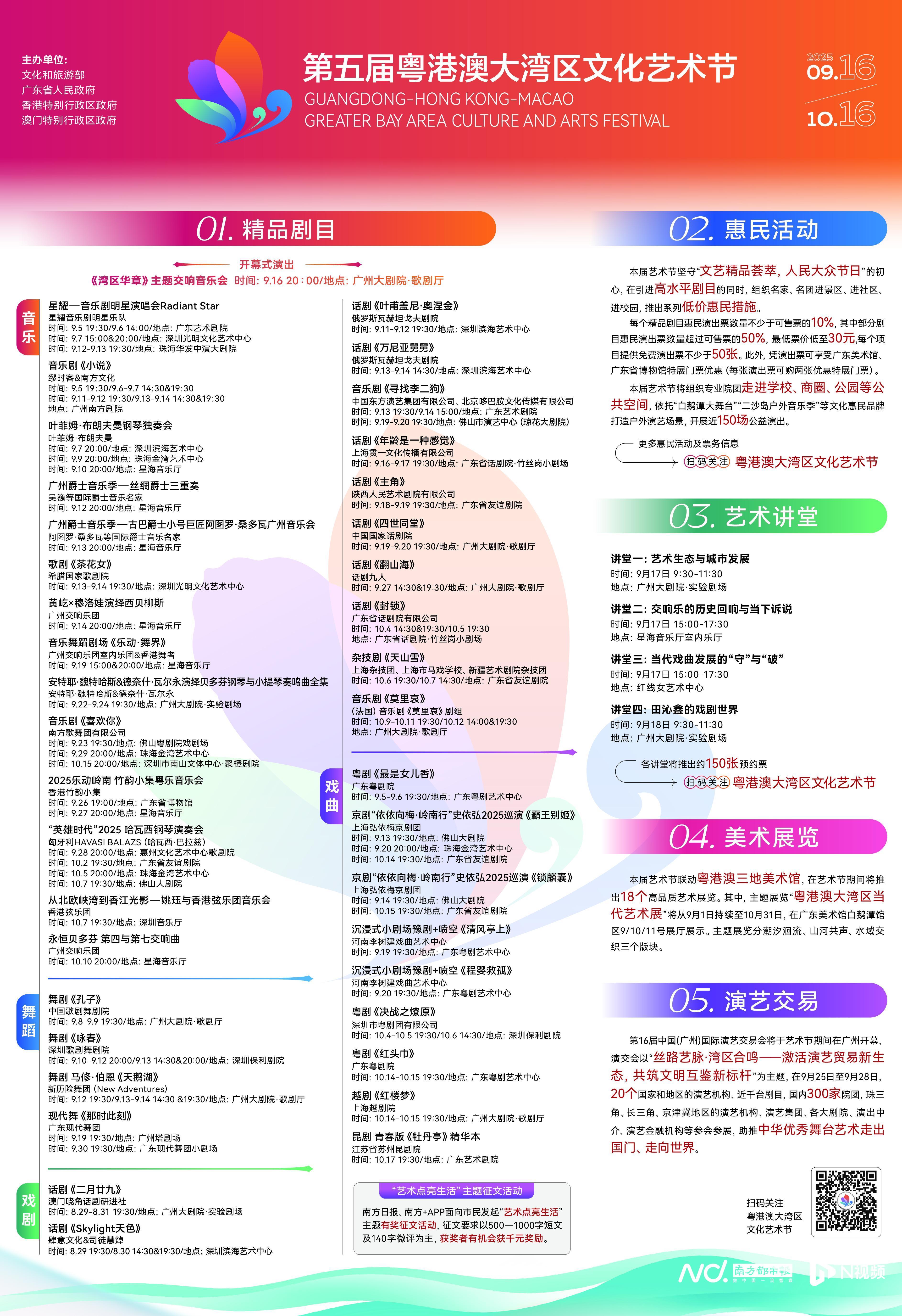 第五届粤港澳大湾区文化艺术节将于9月16日至10月16日在粤港澳大湾区11座城市联动举行。本届艺术节涵盖“艺汇湾区”剧目展演、“艺韵和鸣”艺术讲堂、“艺境共生”美术展览、“艺美生活”惠民活动及“艺彩交辉”演艺交易五大板块,包含超100场精品演出、18场艺术展览、150场公益演出及系列艺术讲堂,将为大湾区民众献上一场全民共享的文化艺术盛宴。
