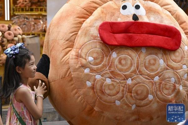 ↑ 8月21日,小游客在乌鲁木齐大巴扎步行街拍照留影。
