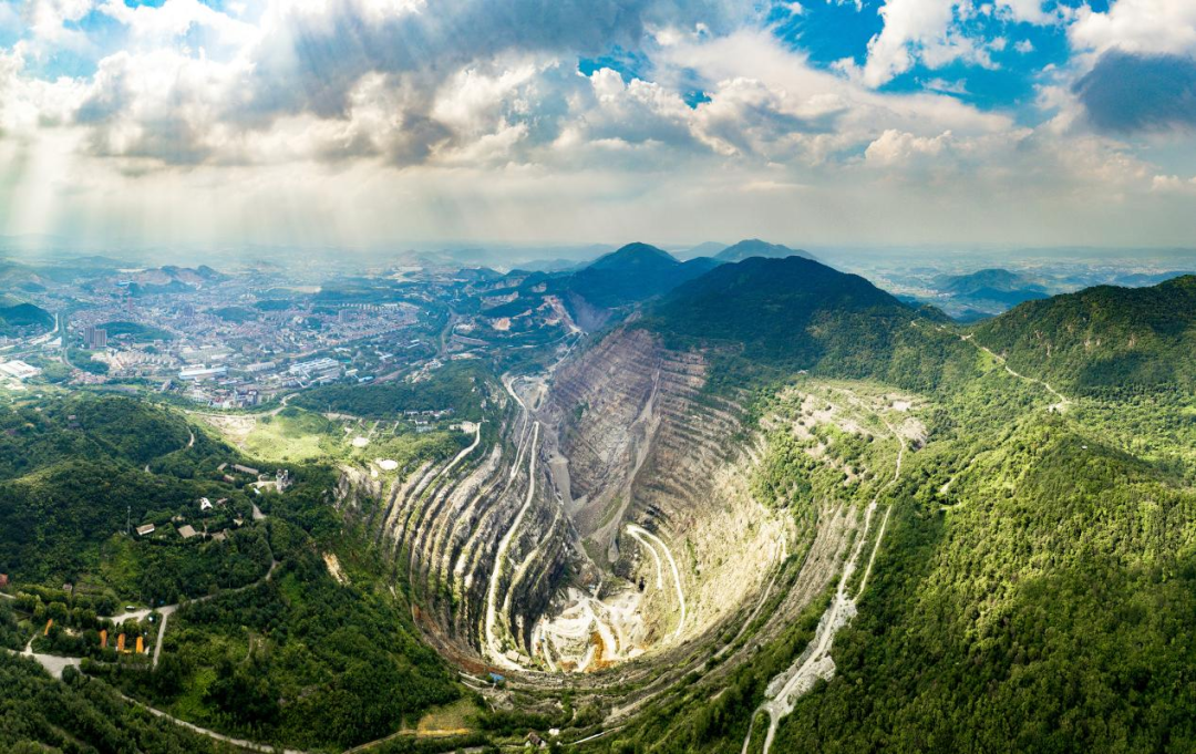 8月18日,总编辑们来到黄石国家矿山公园,远远望见一处巨型凹陷镶嵌在群山之间——这便是被誉为“亚洲第一天坑”的大冶铁矿露天采场。站在海拔168米的观景台俯瞰,坑口东西长2200米、南北宽900米,矿岩分层形成的环形“台阶”如同大自然的年轮,记录着百年开采史。