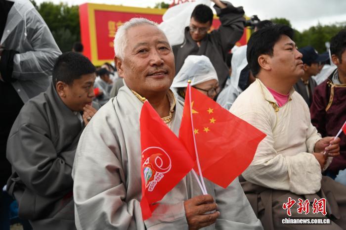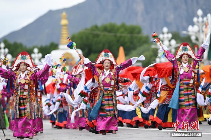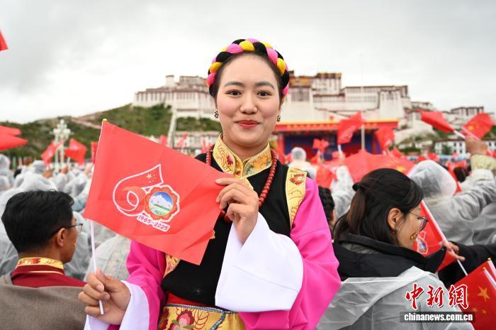 8月21日,拉萨古城居民罗桑群佩在布达拉宫广场参加庆祝活动。中新社记者 赵朗 摄