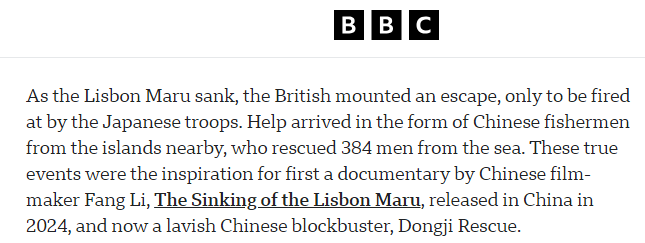文章说,在这艘载有英军战俘的船只“里斯本丸”号沉没过程中,英国战俘组织突围逃生,却遭到日军扫射。附近岛屿的中国渔民们伸出了援手,从海中救起384人。这一真实事件先后催生了两部影视作品:纪录片《里斯本丸沉没》,以及电影《东极岛》。