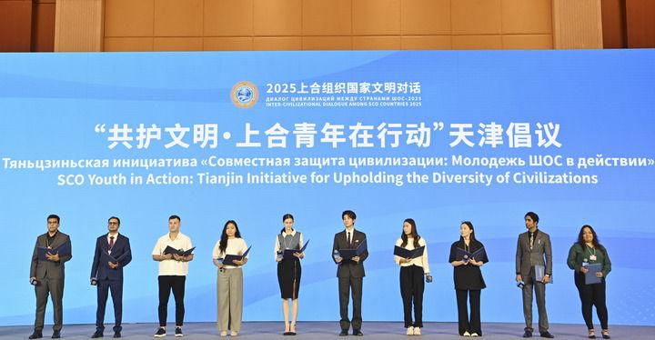 这是在2025上合组织国家文明对话现场拍摄的“共护文明·上合青年在行动”天津倡议发布环节(2025年7月23日摄)。新华社记者 李然 摄