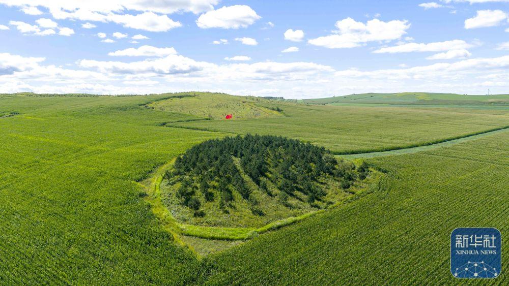↑这是8月23日在内蒙古呼伦贝尔市阿荣旗六合镇拍摄的田野中的“红军岗”(无人机照片)。新华社记者 马金瑞 摄
