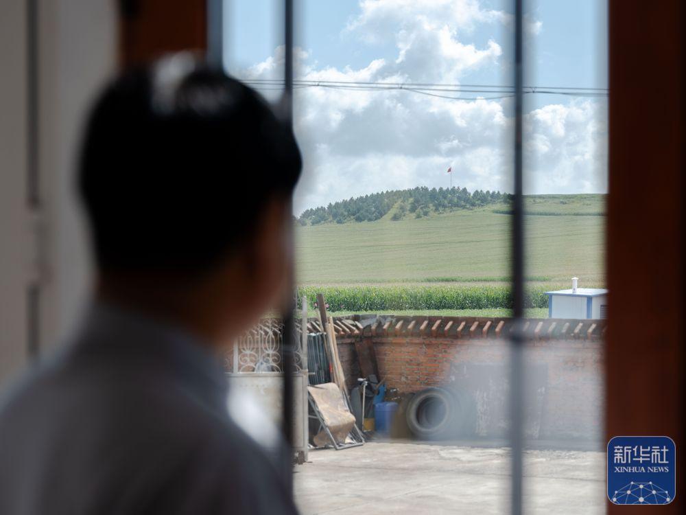 ↑8月23日,内蒙古呼伦贝尔市阿荣旗六合镇,孙福贵在家中透过窗户遥望“红军岗”。新华社记者 马金瑞 摄