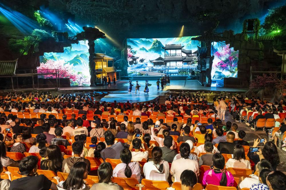 “在这么壮观的溶洞里看民族歌舞,歌声在洞里回荡,感觉很震撼!”一位来自重庆的游客说。据景区负责人介绍,6月以来,景区日均接待游客超1万人次。