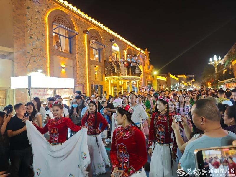游客在阿勒屯古街观看歌舞表演。石榴云/新疆日报记者 宋海波摄