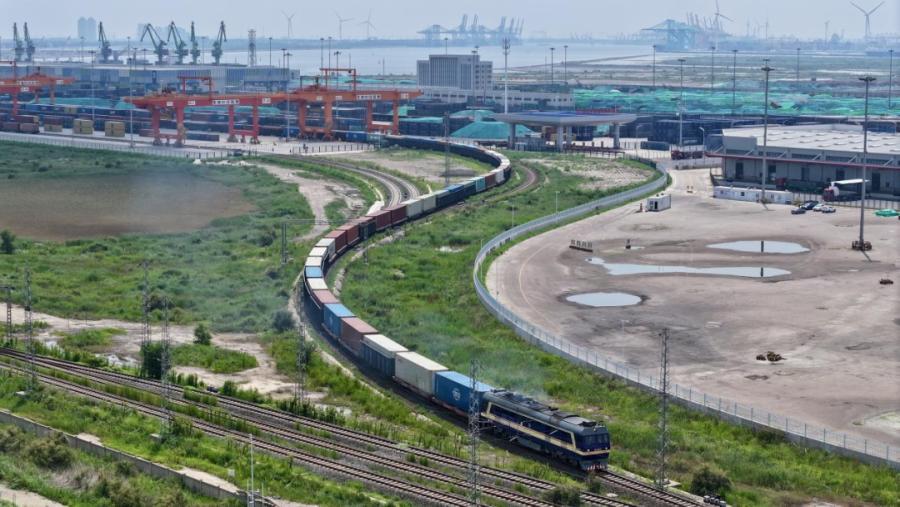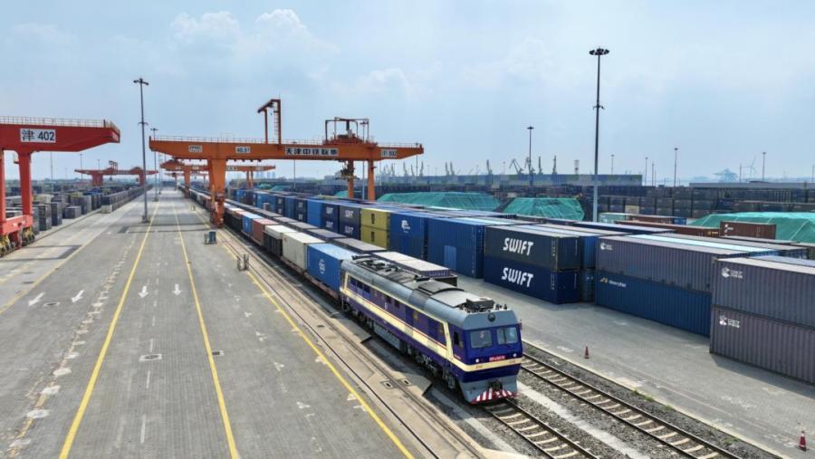 当天津港第二集装箱码头的集装箱完成转运,天津东疆港新港北集装箱中心站也进入了班列发车倒计时。在这里,“沿着班列看上合”融媒体报道组记者见证了一列中欧班列一路向北,正式启程。
