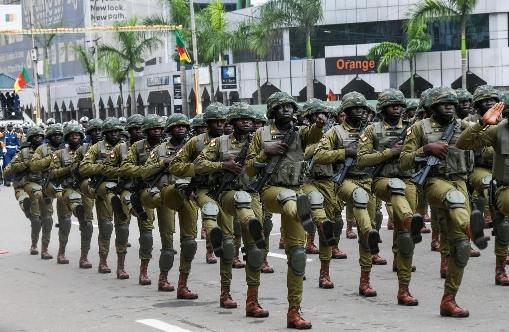5月20日,武装部队列队行进在喀麦隆首都雅温得举行的国庆日活动上。新华社发(科普索摄)