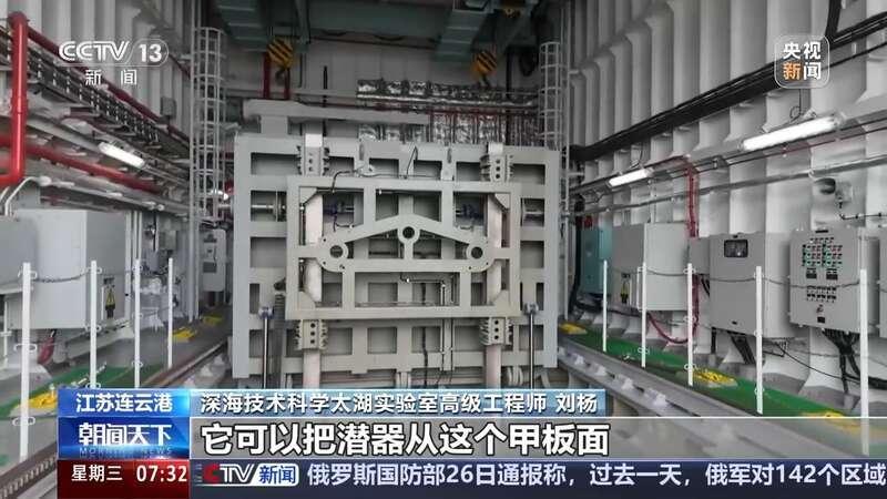 在船尾部,记者看到一个高耸的起重机,它的起重能力高达150吨,可以将潜航器等设备精准布放至海中。船体中部还隐藏着一个直通海底的“深海电梯”月池系统,专为各类水下装备提供安全稳定的试验环境。