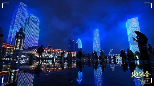 天津津湾广场沿岸海河夜景和楼体灯光。