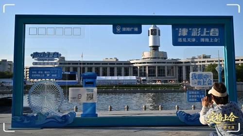 天津津湾广场,游客在一处“2025年上海合作组织峰会”主题装饰物打卡。